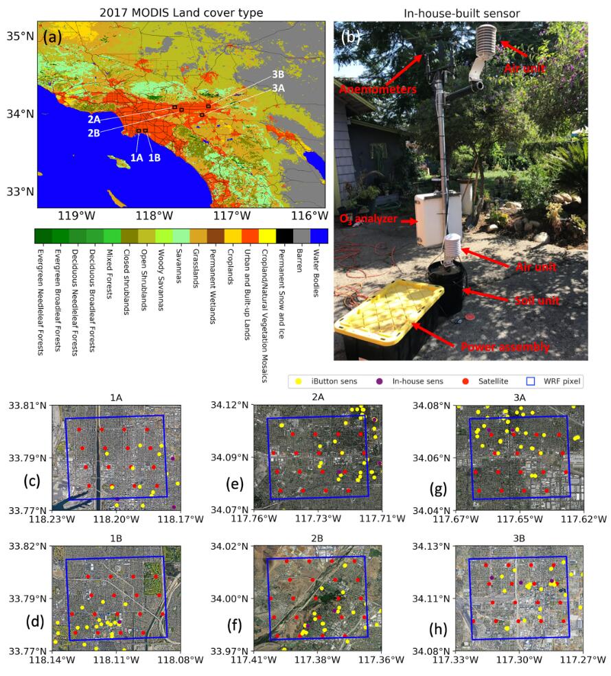 我們設(shè)計了我們的研究,以評估2017 年夏季從單個地塊到洛杉磯大都市區(qū)(圖 1a )的多個尺度的溫度和 O 3變化。我們圍繞單個社區(qū)組織了傳感器部署,我們將其定義為 4 × 4 km 2樣方. 密集的現(xiàn)場部署集中在加利福尼亞州長灘和內(nèi)陸帝國的各個部分(圖 1c-1h),這是洛杉磯大都市地區(qū)的一個子集,嚴(yán)重未達(dá)到 O 3. 部署持續(xù)時間分為三個活動。在 2017 年 6 月至 7 月的第一次活動中,六個傳感器節(jié)點被分布到長灘附近距離小于 20 公里的兩個樣方(每個樣方三個傳感器節(jié)點)(例如,圖 1中的樣方 1A 和 1B) . 通過這種設(shè)計,樣方大小可與空氣質(zhì)量模型和 EPA 排放清單的標(biāo)稱空間分辨率相媲美,后者通常為 4 × 4 km 2,而兩個樣方之間的距離可與 TROPOMI 足跡的尺寸相媲美( 4 × 7 公里2) 在更低點。因此,社區(qū)科學(xué)網(wǎng)絡(luò)的分布非常適合進(jìn)行測量,以解決有關(guān)亞網(wǎng)格尺度模型不確定性和亞像素分辨率衛(wèi)星檢索不確定性的問題。2017 年 7 月至 8 月的第二次活動和 2017 年 8 月至 9 月的第三次活動的部署與第一階段的部署類似,但針對克萊蒙特(圖 1中的 2A 和 2B )和圣貝納迪諾(3A)附近的不同樣方和3B),分別。當(dāng)兩個樣方在項目的每個階段配對以測量子區(qū)域梯度預(yù)期溫度和 O 3時,項目所有三個階段中的鄰域?qū)Χ急贿x擇以共同反映區(qū)域梯度。