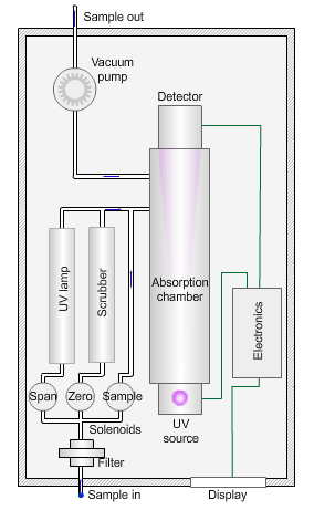 為了確定臭氧濃度,泵將環(huán)境空氣樣本通過過濾器吸入吸收室,在吸收室中,來自汞蒸氣燈的波長(zhǎng)為 254nm 的紫外線照射樣本。